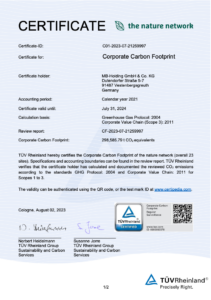 MartinBauer und alle weiteren Unternehmen der globalen Firmengruppe the nature network erbringen mit Hilfe des TÜV Rheinland einen transparenten Nachweis über die Einsparung von insgesamt 29.000 Tonnen CO2e-Emissionen innerhalb eines Jahres.